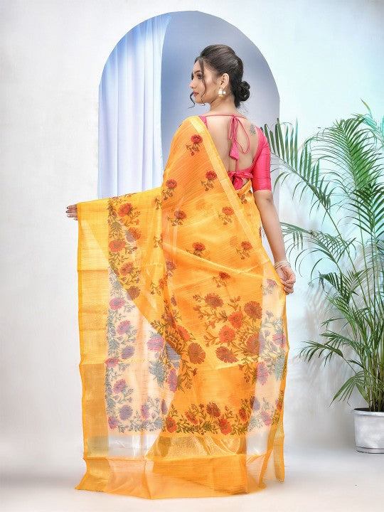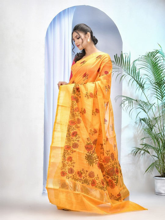 Women's Floral Printed Zari Handloom Taant Saree with Zari Border