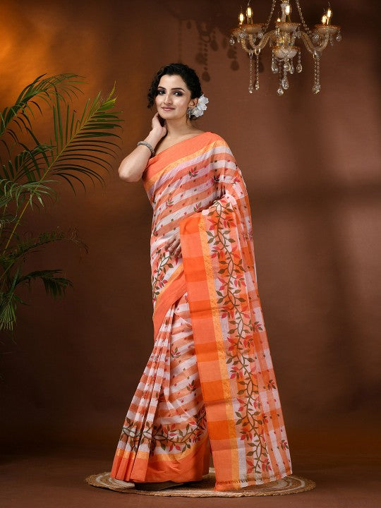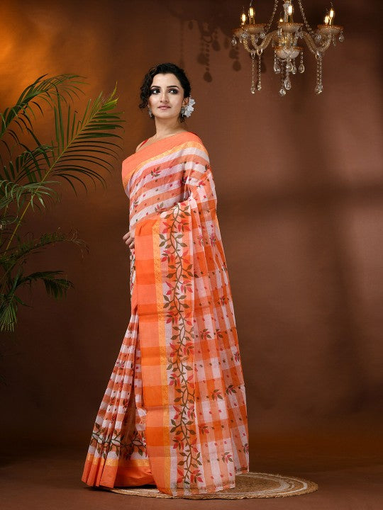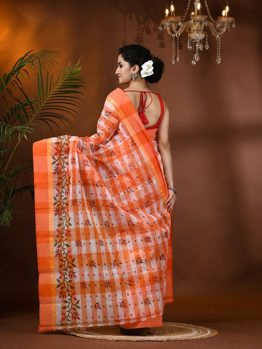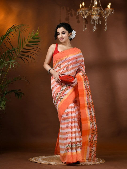 Orange & White Pure Cotton Madhabilata Print Design Saree
