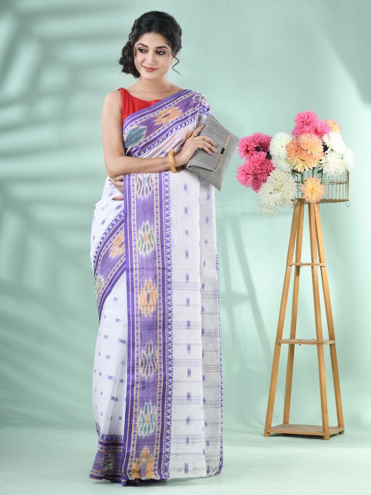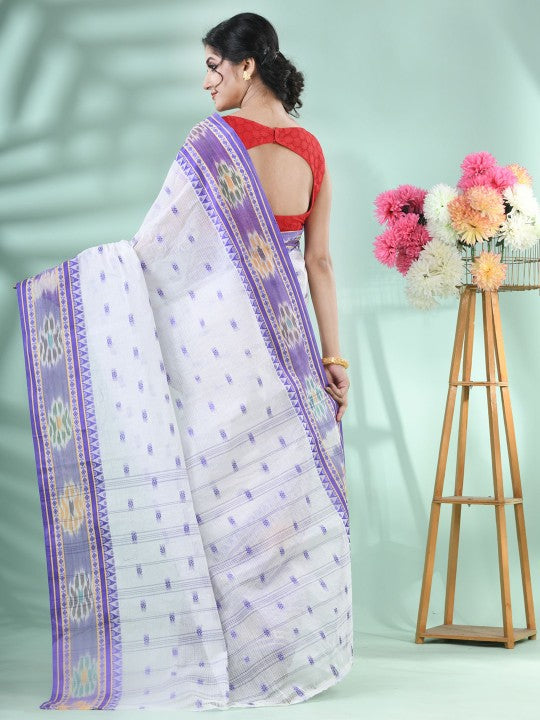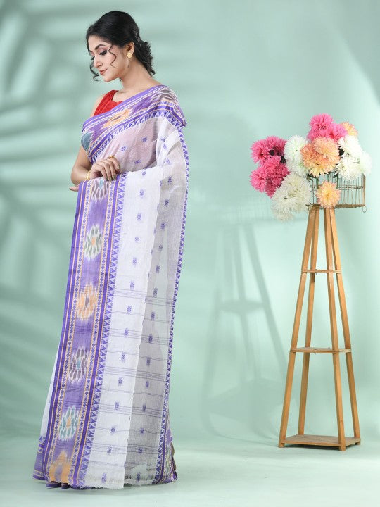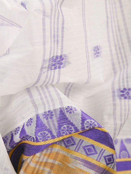 Unleash your inner diva with this stunning pure cotton saree, a true masterpiece of traditional Indian weaving. The beautiful purple and white hues blend seamlessly, adorned with intricate woven patterns that tell a story of craftsmanship. This saree is perfect for any festive occasion or a casual day out, ensuring you look effortlessly graceful and charming. Its lightweight and breathable fabric will keep you comfortable all day long, making it a delightful addition to your ethnic wardrobe. Pair it with your favorite blouse and accessories to create a captivating look that's uniquely you.