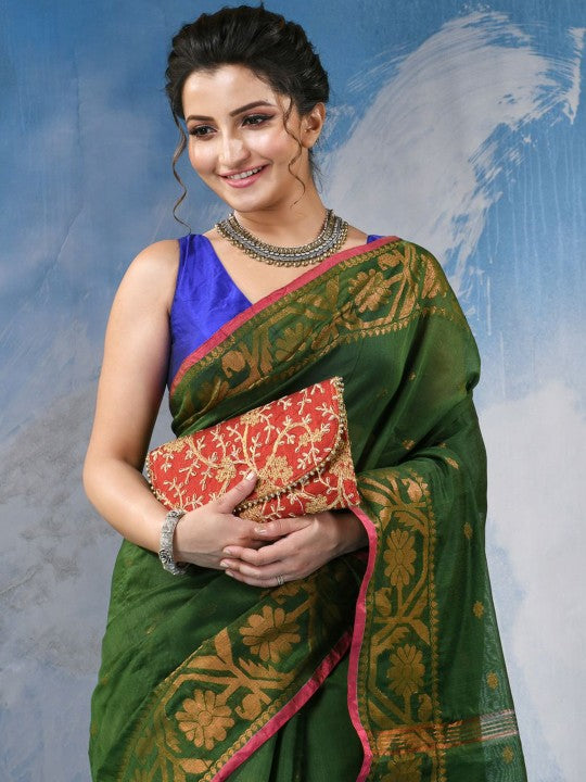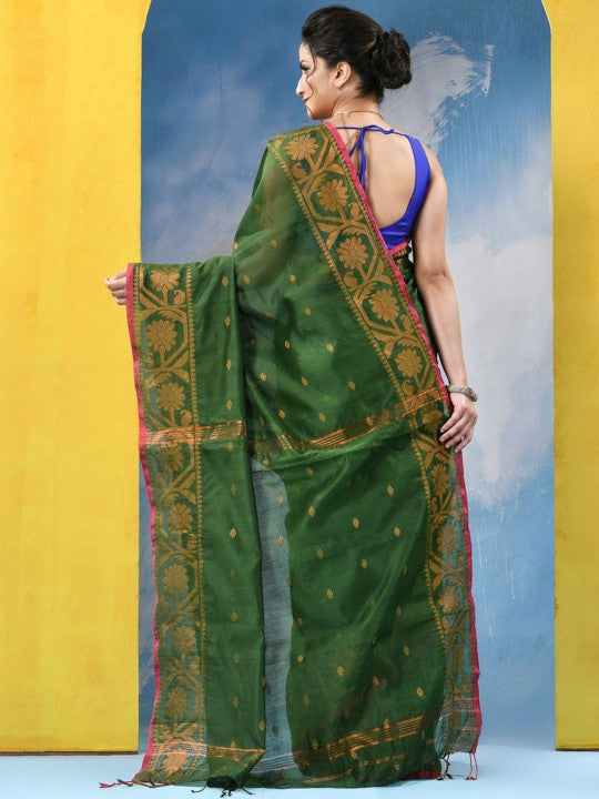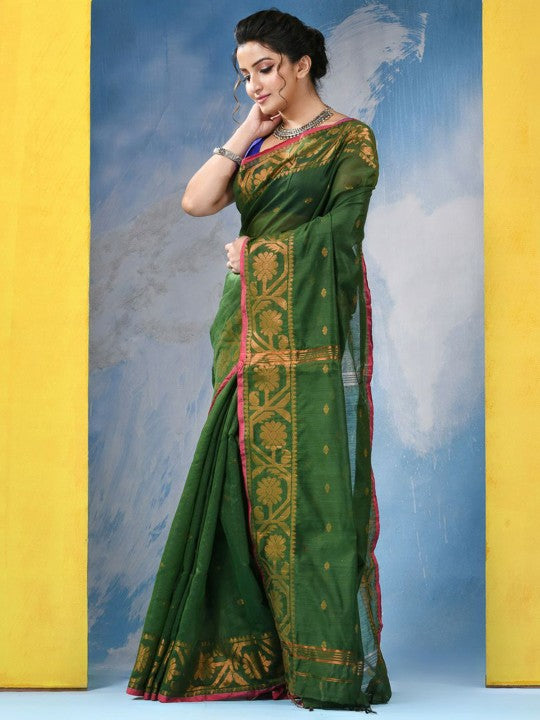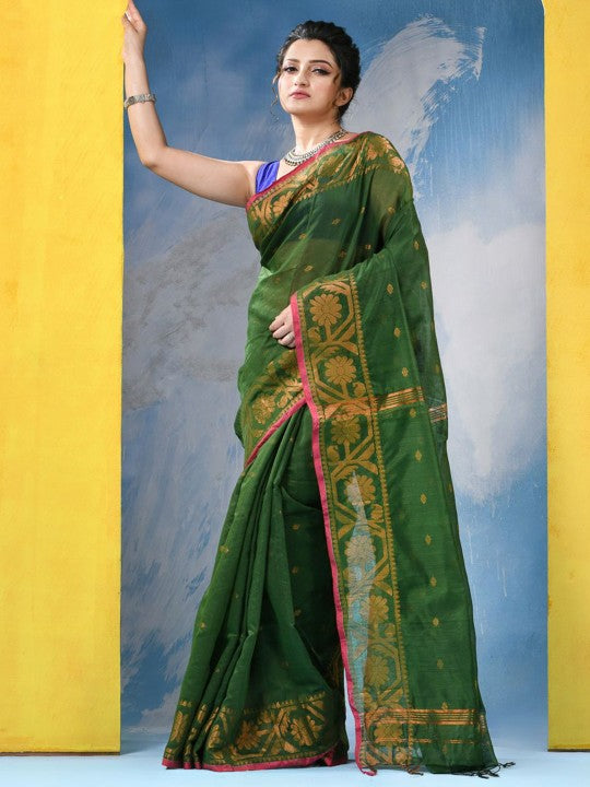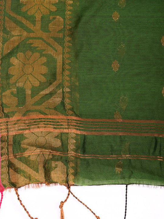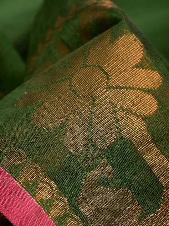 This exquisite saree, crafted from a luxurious cotton-silk blend, features a sophisticated woven design with intricate zari detailing. The rich green and gold tones create a regal aesthetic, perfect for special occasions. The saree boasts a beautifully woven border, enhancing its traditional appeal. This elegant garment offers a blend of comfort and timeless style, making it a valuable addition to any discerning wardrobe. The fabric's inherent sheen adds a touch of glamour without being ostentatious. This saree is designed to drape gracefully, complementing various body types. It is suitable for cultural events, festivities, and formal gatherings. The meticulous craftsmanship ensures durability and enduring beauty. This piece represents a blend of traditional artistry and contemporary elegance.