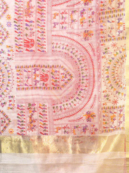 Design Details White and white bandhani saree. Woven design printed saree with zari border border. The saree comes with an unstitched blouse piece. The blouse worn by the model might be for modelling purpose only. Check the image of the blouse piece to understand how the actual blouse piece looks like.