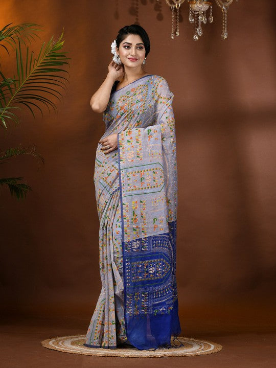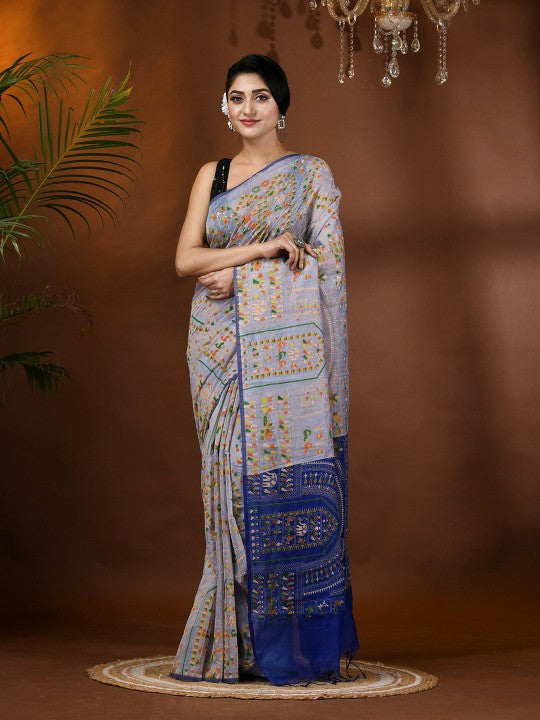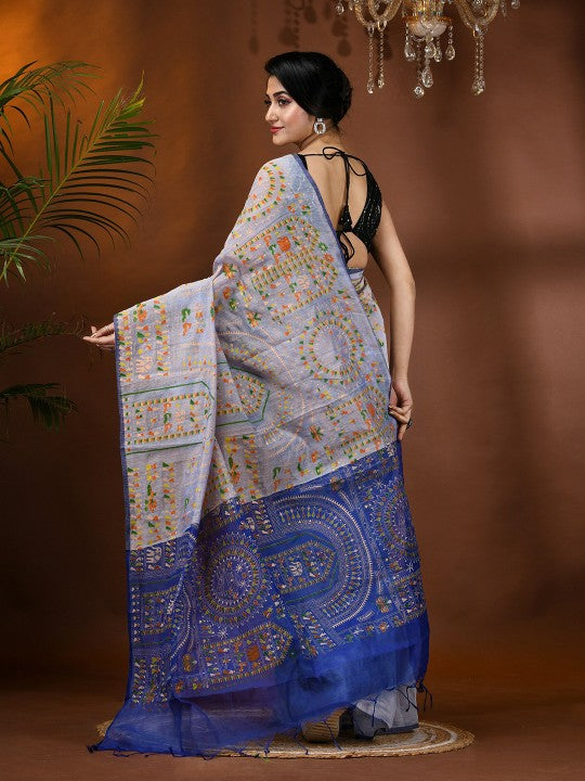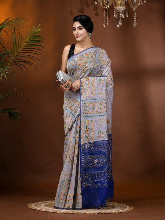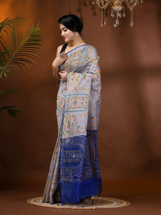 Woven Design Block Print Cotton Silk Saree with Tassels