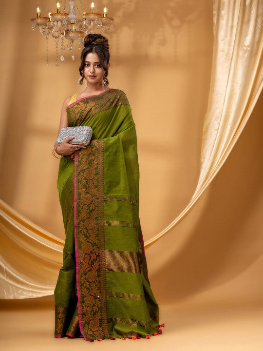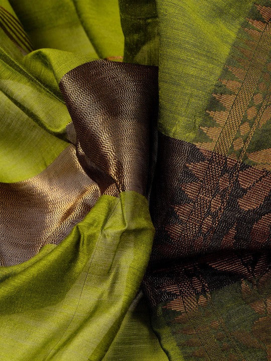 Green and copper-toned chanderi saree. Solid saree with woven design border. Has zari detail. The saree comes with an unstitched blouse piece. The blouse worn by the model might be for modelling purpose only. Check the image of the blouse piece to understand how the actual blouse piece looks like.