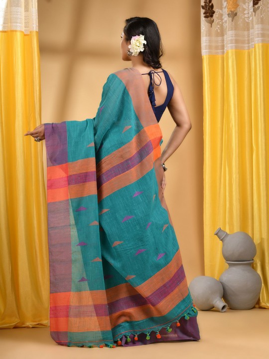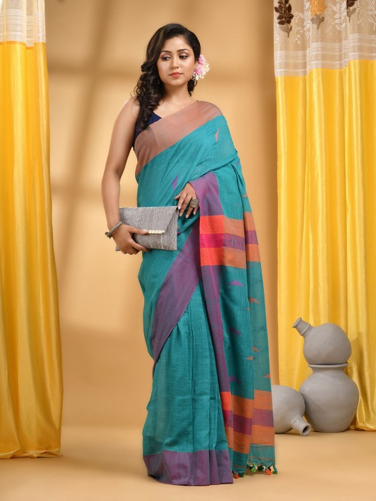 This elegant DESH BIDESH saree features a captivating turquoise blue and purple colour combination. It boasts an intricate woven design throughout, complemented by a beautifully crafted woven design border. The saree is made from pure cotton fabric, ensuring comfort and breathability for extended wear. It comes with an unstitched blouse piece, also crafted from pure cotton, allowing for custom tailoring to your preferred style. The lightweight taant weave makes it suitable for various occasions, from daily wear to festive gatherings. This traditional Indian attire reflects a rich heritage of craftsmanship and timeless beauty. The unstitched blouse piece offers versatility, enabling you to create a perfect matching or contrasting look. Its soft texture drapes gracefully, enhancing your silhouette. Designed for dry clean only care, this saree maintains its vibrant colours and delicate weave. Embrace classic Indian elegance with this exquisite and versatile cotton taant saree.