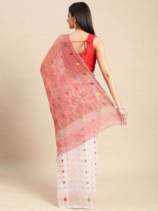 Design Details White and red jamdani saree Ethnic motifs woven design saree with woven design border. The saree does not come with a blouse piece. The model is wearing a blouse for modelling purpose only.