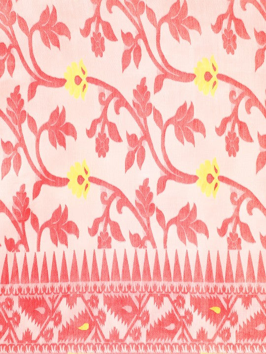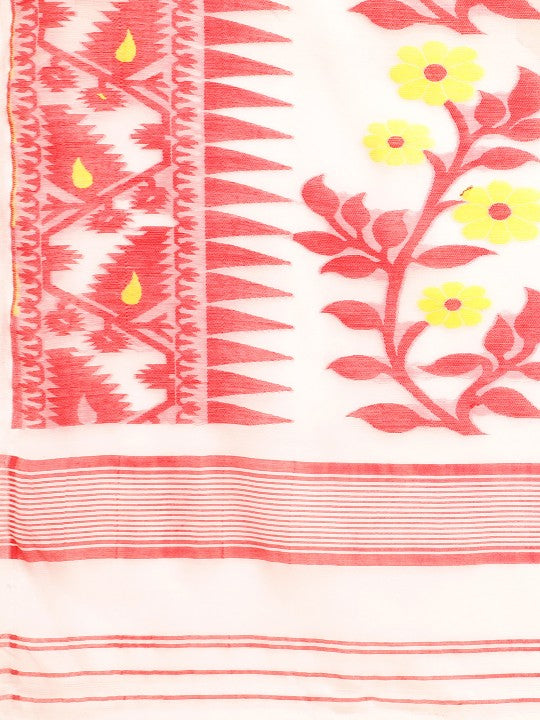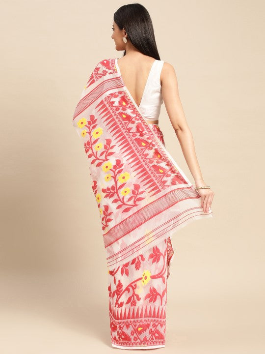 This exquisite DESH BIDESH Jamdani Saree showcases a stunning red hue, perfect for cultural events and festive occasions. It features intricate ethnic motifs with a beautiful woven design border, adding a touch of traditional elegance. Crafted from 100% pure cotton, this saree ensures exceptional comfort and breathability throughout the day. The fine Jamdani weave, originating from Bengal, makes this piece a true work of art. This versatile drape offers a sophisticated look, suitable for both formal gatherings and casual celebrations. Its lightweight fabric allows for graceful movement and easy draping, enhancing the wearer's silhouette. The vibrant colours and detailed patterns make it a standout addition to any ethnic wear collection. It is designed for longevity and retains its charm with proper care. Please note, the saree package does not include a blouse piece; the model's blouse is for styling purposes only. Maintain its pristine condition with dry clean care, avoiding tumble drying and bleaching, and iron on low heat.