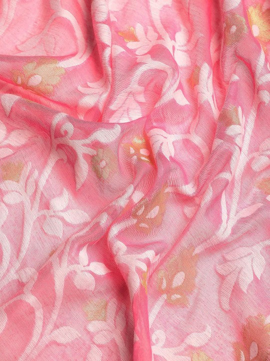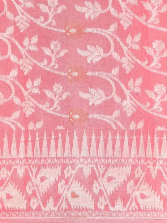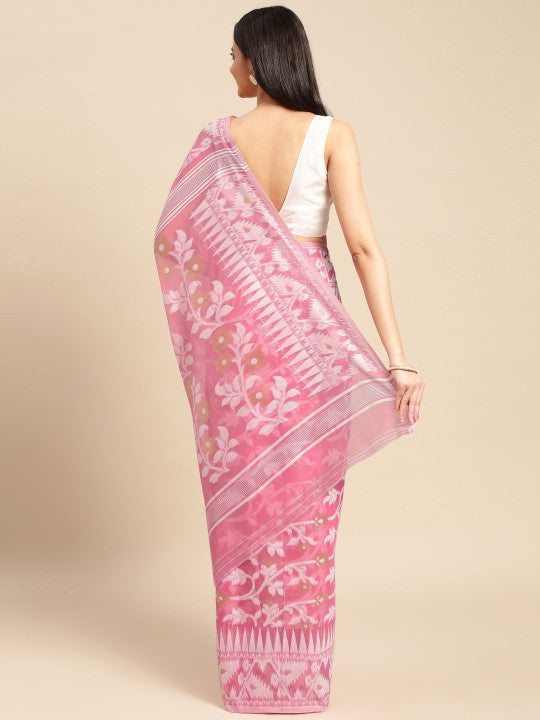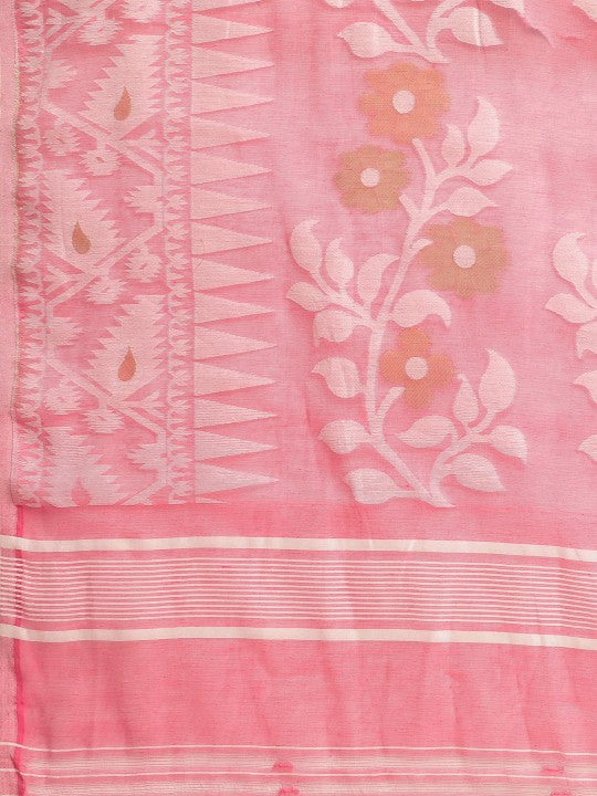 Pink jamdani saree. Ethnic motifs woven design saree with woven design border. The saree does not come with a blouse piece. The model is wearing a blouse for modelling purpose only.