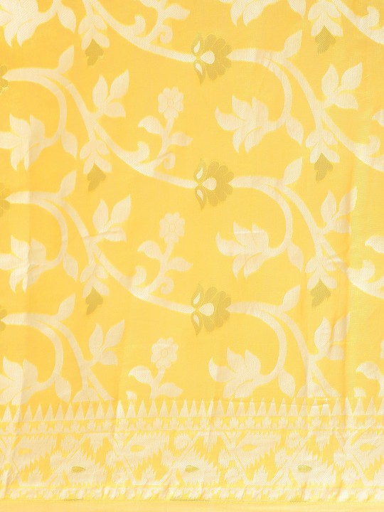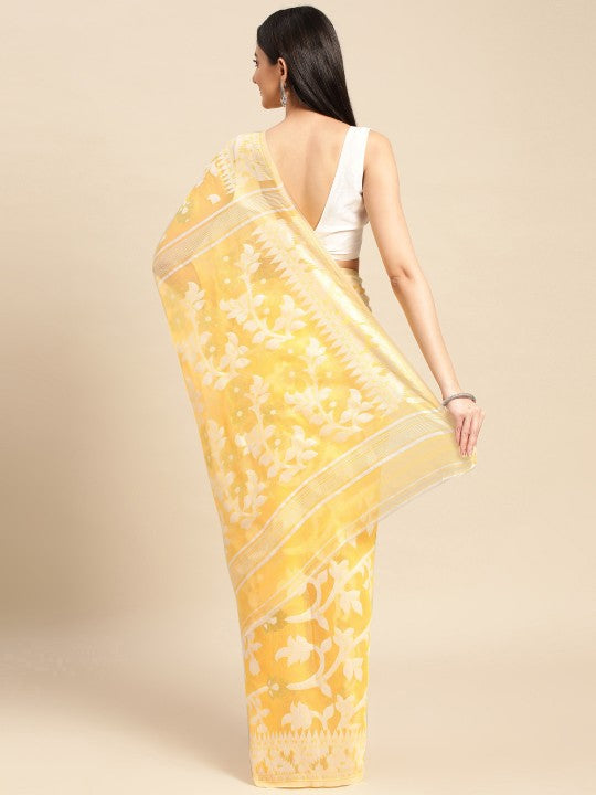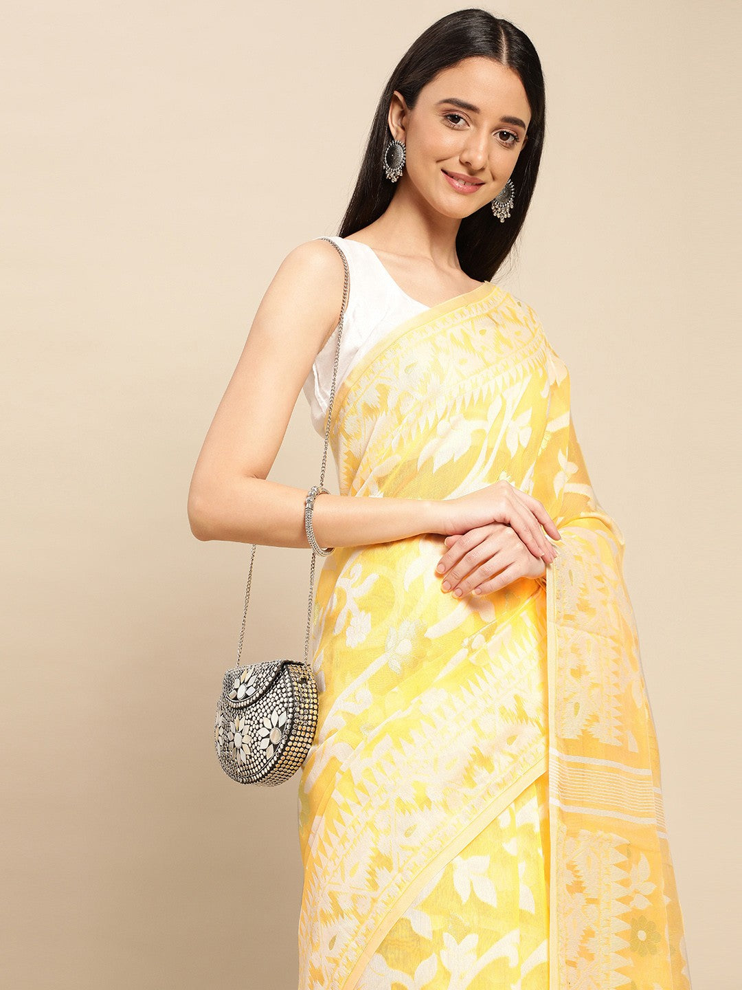 This yellow jamdani saree features intricate ethnic motifs and a beautiful woven design border. The saree does not include a blouse piece; the model is wearing one for illustrative purposes only. This elegant saree for women can be purchased from DESH BIDESH at Rs. 1295. The product's Style ID is 21699730.