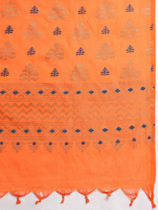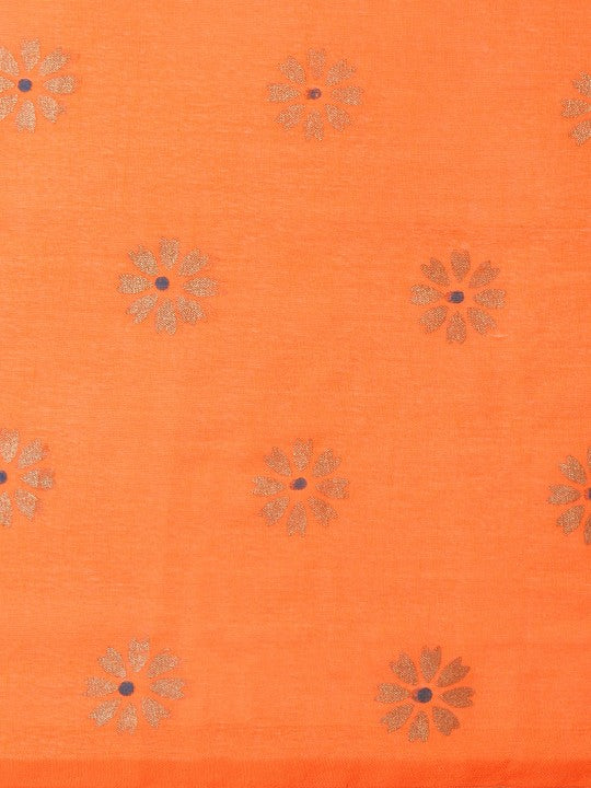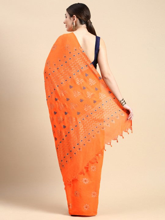 This elegant orange khadi saree features exquisite ethnic motifs with a finely woven border, showcasing traditional craftsmanship. Crafted from pure cotton, it ensures comfort and breathability for all-day wear. The saree includes an unstitched blouse piece, allowing for custom tailoring to achieve a perfect fit. Please note that the blouse worn by the model is for styling purposes only; refer to the provided image of the blouse piece to see its actual appearance. For maintenance, it is recommended to dry clean this beautiful garment to preserve its quality and intricate design. This saree is a perfect blend of traditional aesthetics and modern comfort.