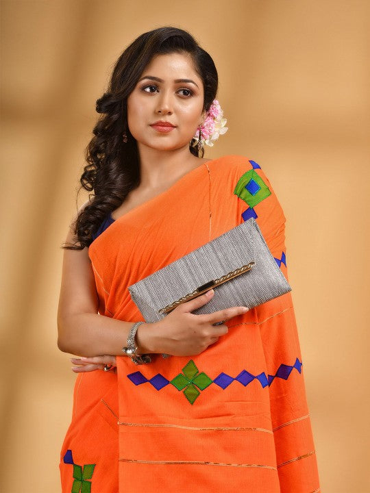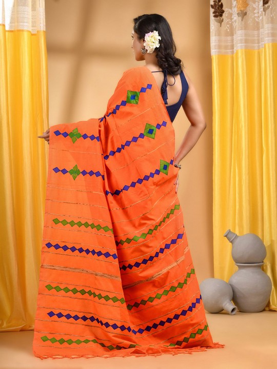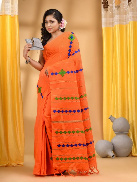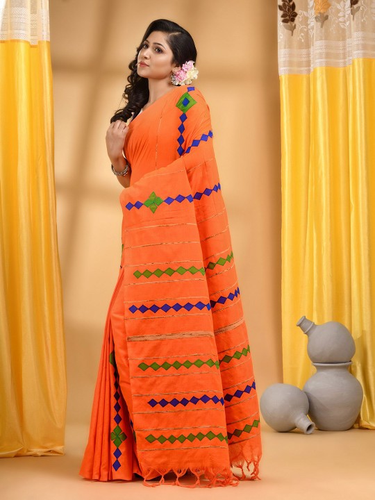 Buy DESH BIDESH Woven Design Patchwork Pure Cotton Taant Saree - Sarees for Women from DESH BIDESH at Rs. 1415. Style ID: 33242716. This orange and green taant saree features a woven design with no border. It has intricate patchwork detail throughout. The saree comes with an unstitched blouse piece. Please note that the blouse worn by the model might be for styling purposes only; kindly check the image of the blouse piece to understand its actual appearance.