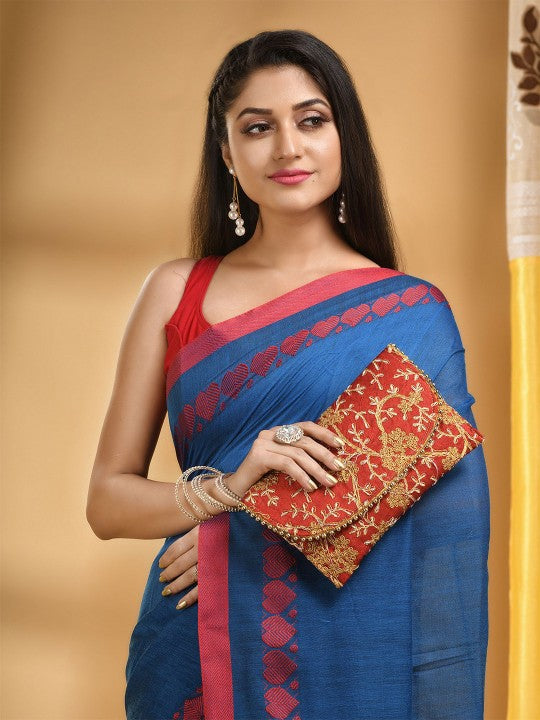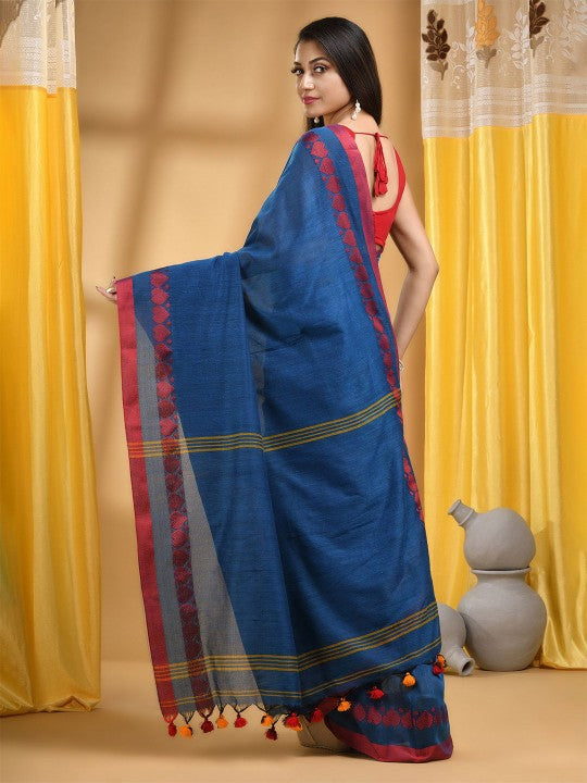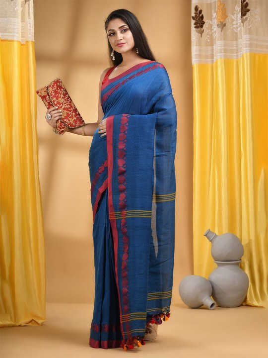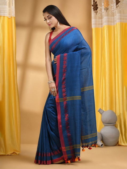 Design Details Blue taant saree Woven design saree with solid border border The saree comes with an unstitched blouse piece The blouse worn by the model might be for modelling purpose only. Check the image of the blouse piece to understand how the actual blouse piece looks like.