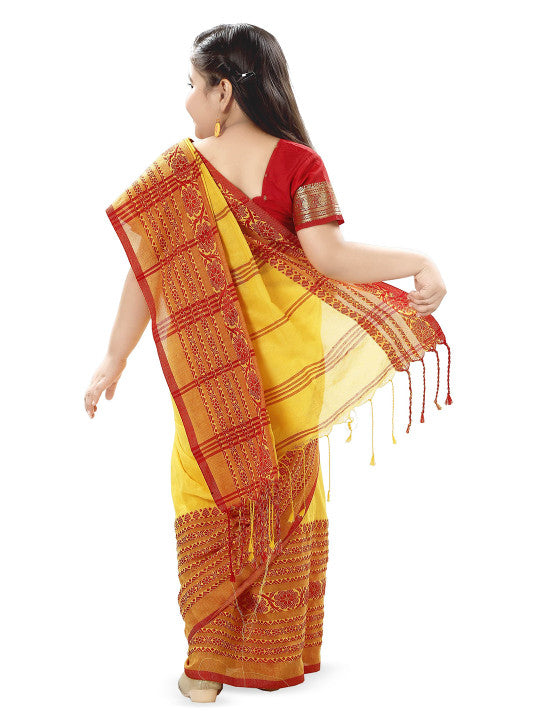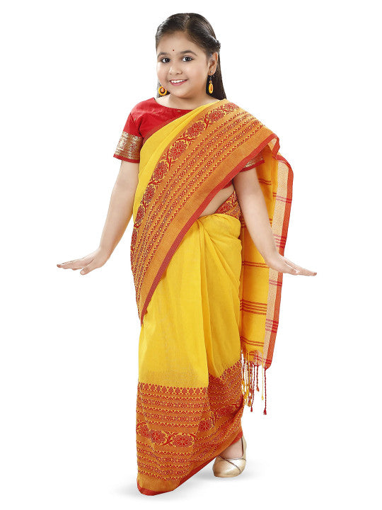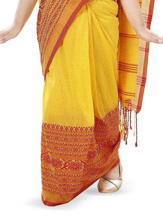 This elegant DESH BIDESH Khadi Saree features a striking yellow and red colour combination, ideal for various occasions. It is a woven design saree, gracefully adorned with a complementary woven design border. The saree measures approximately 6.0 yards in length and comes with an additional 0.9 yard blouse piece. Its approximate width is 1.2 yards, ensuring a comfortable and flattering drape. Crafted from pure cotton fabric, this saree promises exceptional comfort and breathability throughout the day. The Khadi type of weave reflects traditional craftsmanship and rich Indian heritage. The intricate woven design enhances the saree's aesthetic appeal, making it a sophisticated choice. For optimal care, dry cleaning is recommended to maintain the fabric's quality and vibrant hues. This DESH BIDESH saree (Style ID: 36385870) combines traditional elegance with modern comfort. It is a perfect addition to any discerning wardrobe.