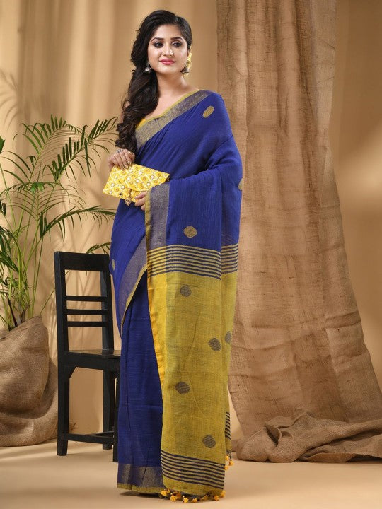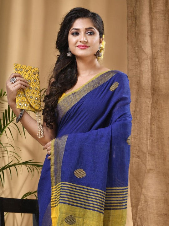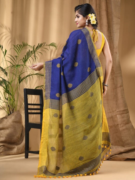 This beautiful DESH BIDESH saree features a captivating blue and yellow khadi design. It boasts an intricate woven pattern with a distinct woven design border, adding elegance to its appeal. The saree includes an unstitched blouse piece, allowing for custom tailoring to achieve a perfect fit. Crafted from pure cotton for both the saree and the blouse fabric, it ensures comfort and breathability. For maintenance, dry clean is recommended to preserve its quality and vibrancy.