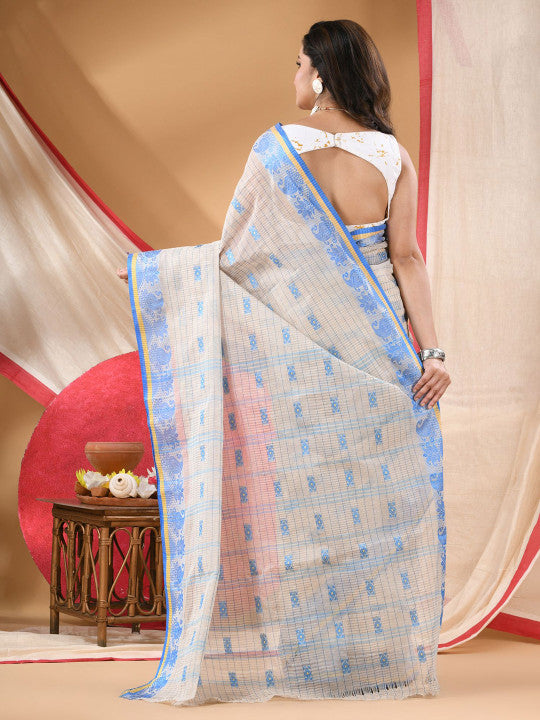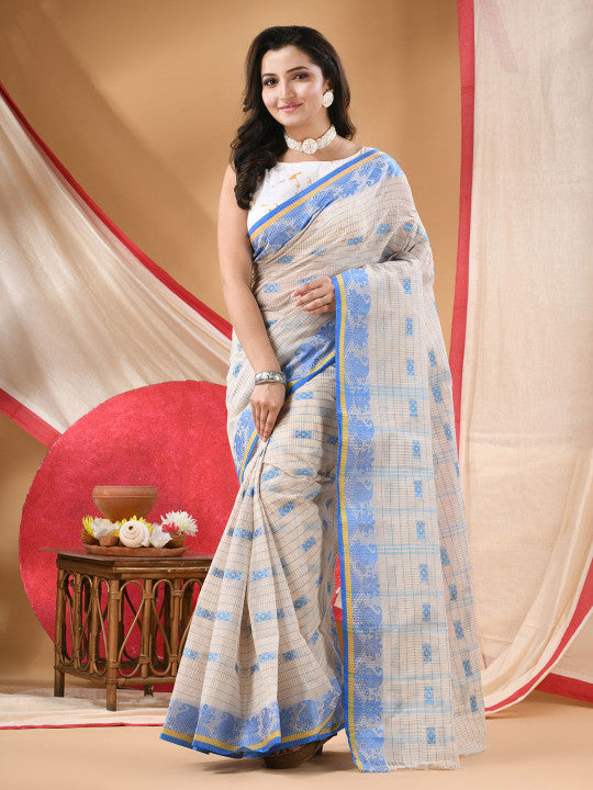 Off white saree. Woven design saree with woven design border. Length: 5.5 metres plus 0.8 metre blouse piece. Width: 1.06 metres (approx.). Saree Fabric Pure Cotton. Dry Clean.