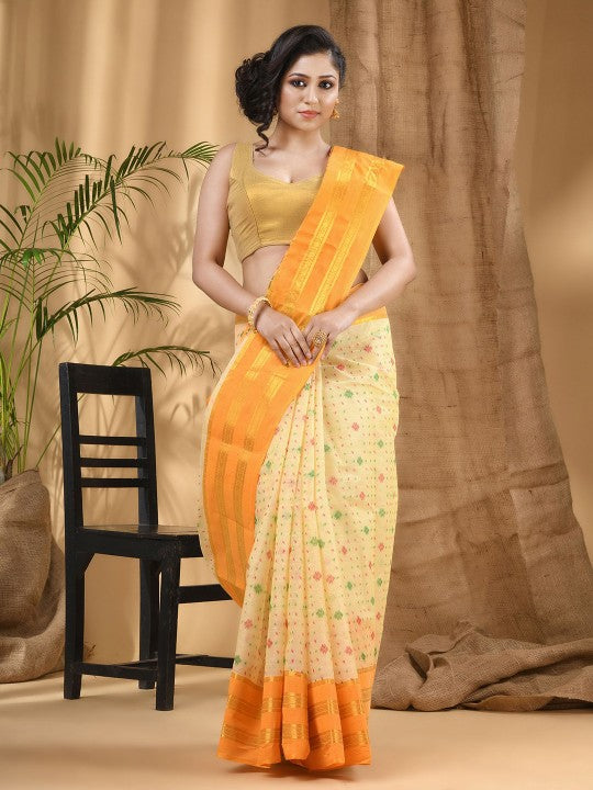 Description This DESH BIDESH Woven Design Pure Cotton Taant Saree is a splendid addition to any woman's ethnic wardrobe. It features a charming yellow hue adorned with an intricate woven design. The saree is elegantly framed by a solid border, enhancing its traditional appeal. Crafted from pure cotton, it ensures exceptional comfort and breathability for extended wear. This taant saree is perfect for various cultural events, daily wear, or festive occasions. Its lightweight nature allows for graceful draping and ease of movement. The vibrant color palette makes it versatile for pairing with different blouses and accessories. This piece reflects excellent craftsmanship and attention to detail. It embodies the rich heritage of Indian textiles. A must-have for those seeking classic elegance and comfort in traditional attire.