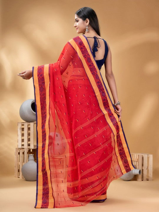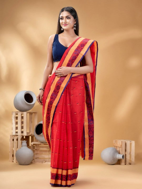 Red and black taant saree. Woven design saree with woven design border. The model is wearing a blouse from our stylist's collection; the saree does not come with a blouse piece.