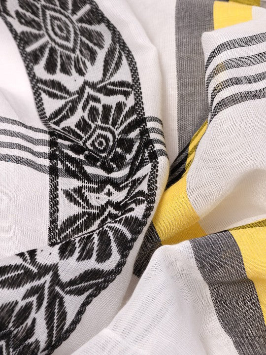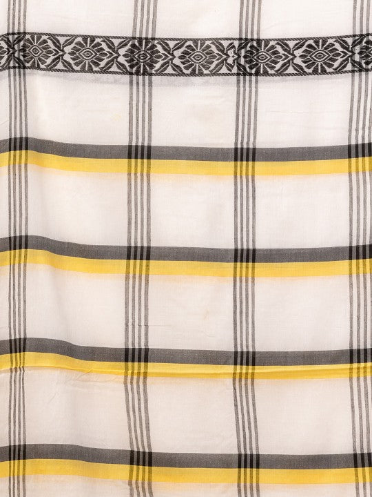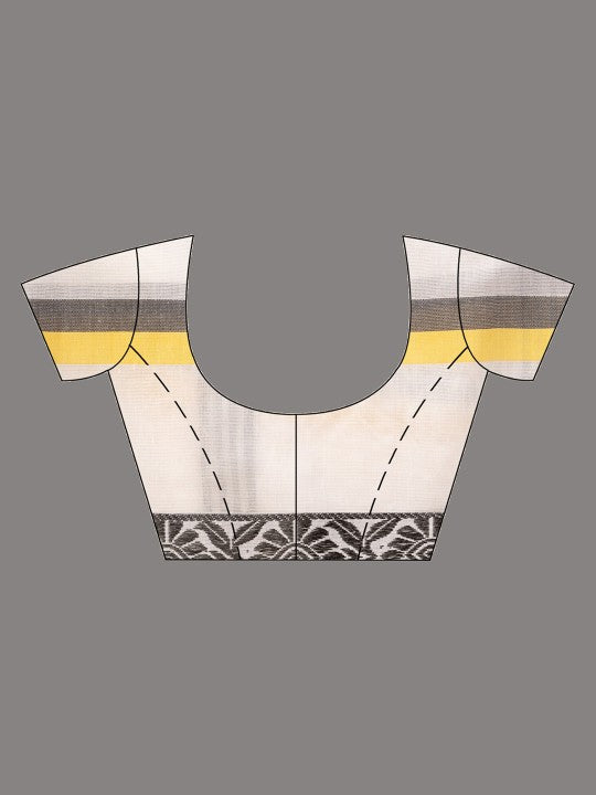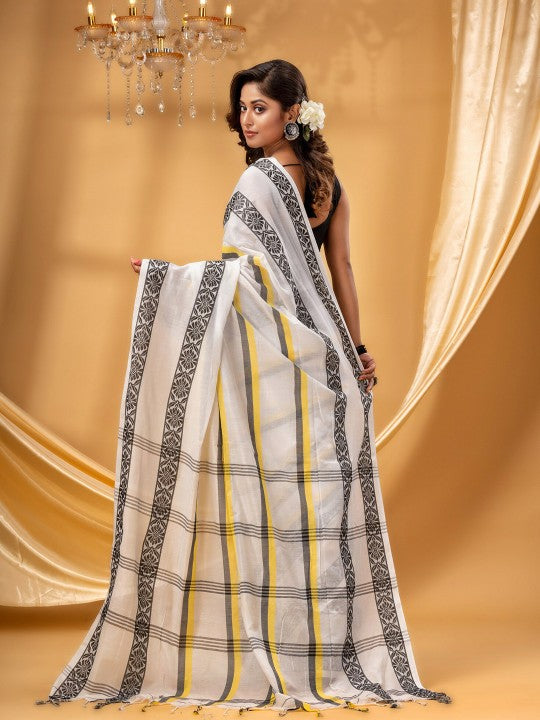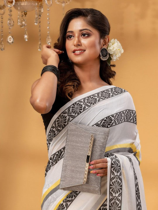 White and black taant saree. This elegant saree features a beautifully crafted woven design border, adding a touch of traditional charm. The saree comes with an unstitched blouse piece, allowing for custom tailoring to ensure a perfect fit. The blouse worn by the model is for styling purposes only; please refer to the provided image of the blouse piece for its actual appearance. Made from pure cotton, this saree offers exceptional comfort and a graceful drape, making it suitable for various occasions.