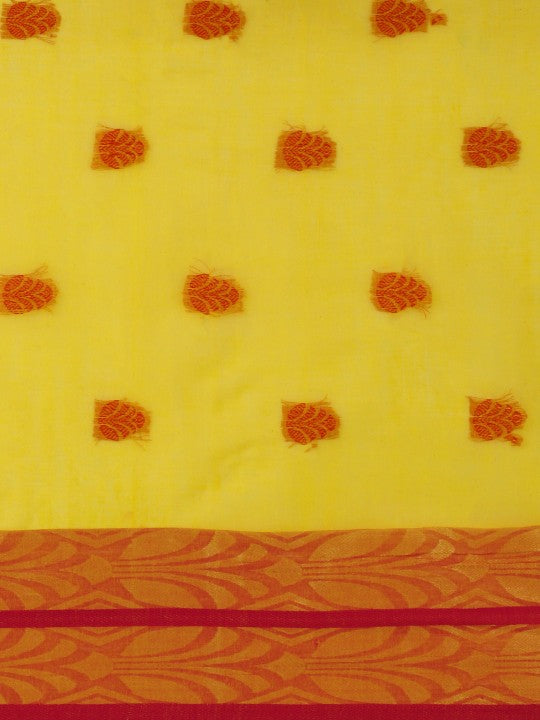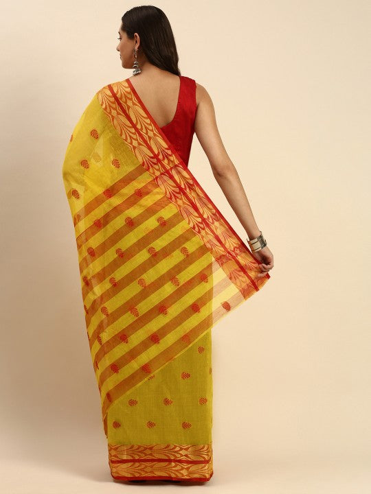 This DESH BIDESH Woven Design Pure Cotton Taant Saree is a beautiful choice for women. It features an exquisite yellow hue with intricate woven patterns and a distinctive woven border. Crafted from pure cotton, this saree offers both elegance and comfort. Please note, the product includes the saree only; the blouse shown on the model is for styling purposes. This traditional piece is perfect for festive occasions, cultural events, or daily wear, showcasing rich Indian textile artistry. Its lightweight and breathable fabric ensure a graceful drape. Embrace classic style with this authentic and charming taant saree.