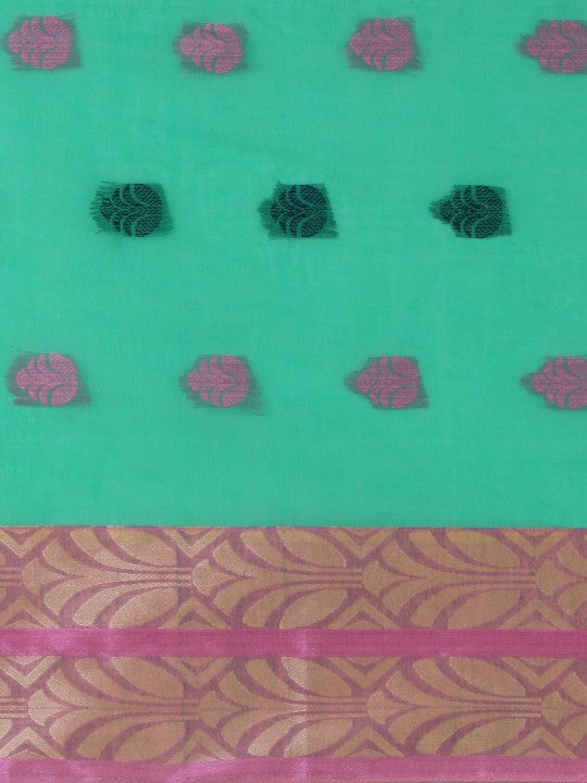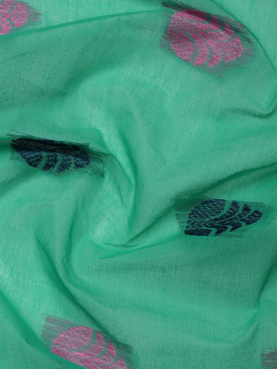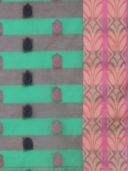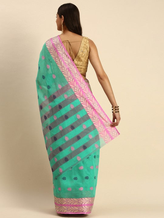 Buy DESH BIDESH Woven Design Pure Cotton Taant Saree - Sarees for Women from DESH BIDESH at Rs. 1115. Style ID: 21071138. This green taant saree features a woven design ethnic motif with a matching woven design border. Please note, the saree does not come with a blouse piece; the model is wearing a blouse for modelling purposes only. It measures approximately 5.5 metres in length and 1.06 metres in width. The saree fabric is pure cotton, requiring dry clean care.