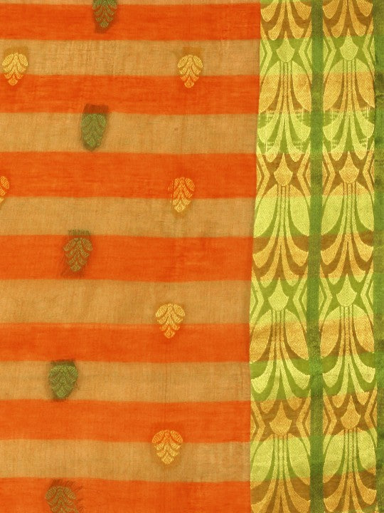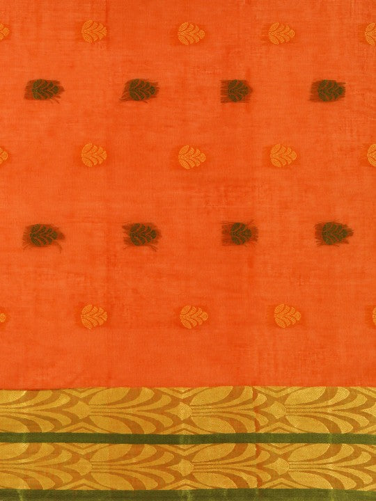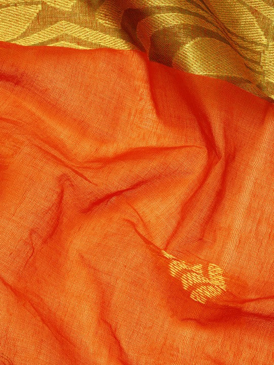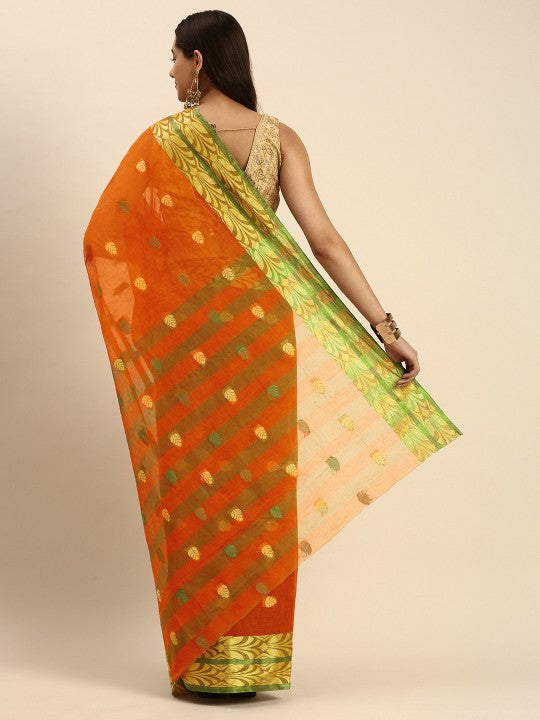 Orange taant saree. Woven design saree with woven design border. The saree does not come with a blouse piece. The model is wearing a blouse for modelling purpose only.