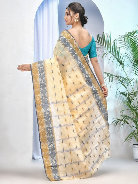 Adorn yourself in the timeless elegance of the DESH BIDESH Pure Cotton Taant Saree, meticulously crafted with exquisite woven designs. This beautiful saree, featuring a captivating blue and gold-toned border, is perfect for various traditional events and daily comfort. Made from breathable pure cotton, it ensures a comfortable drape all day long. The lightweight Taant weave offers graceful movement and an effortlessly chic look. Complete your ethnic ensemble with the included matching blouse piece. This authentic Indian saree embodies rich heritage and superior craftsmanship, making it a valuable addition to your wardrobe. Elevate your style quotient with this stunning and versatile attire. A must-have for every discerning woman. Experience the subtle sheen and soft texture. Shop now for a blend of tradition and contemporary allure.