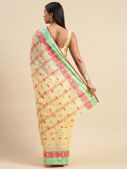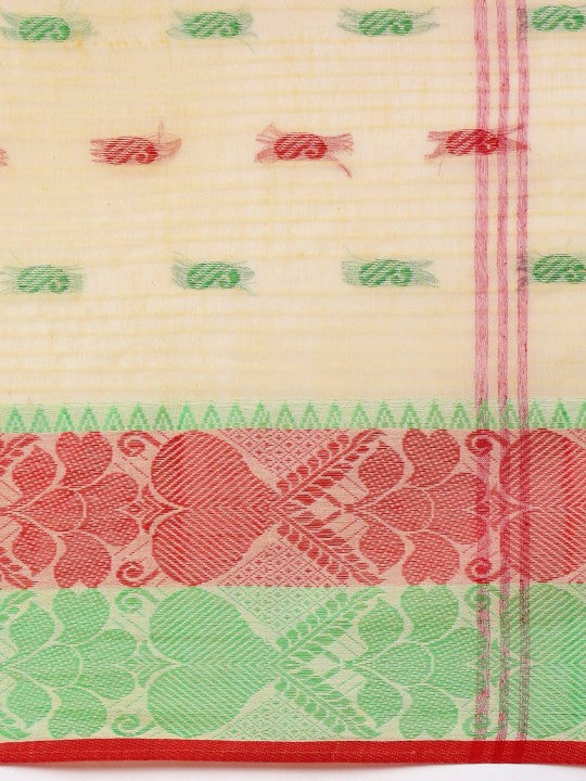 Off white and red taant saree. Woven design saree with woven design border. The saree does not come with a blouse piece. The model is wearing a blouse for modelling purpose only.