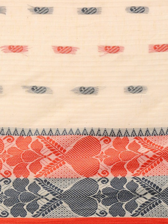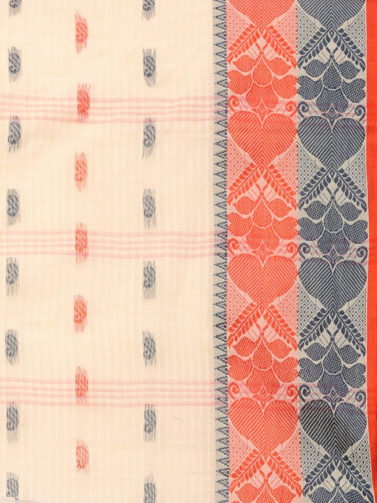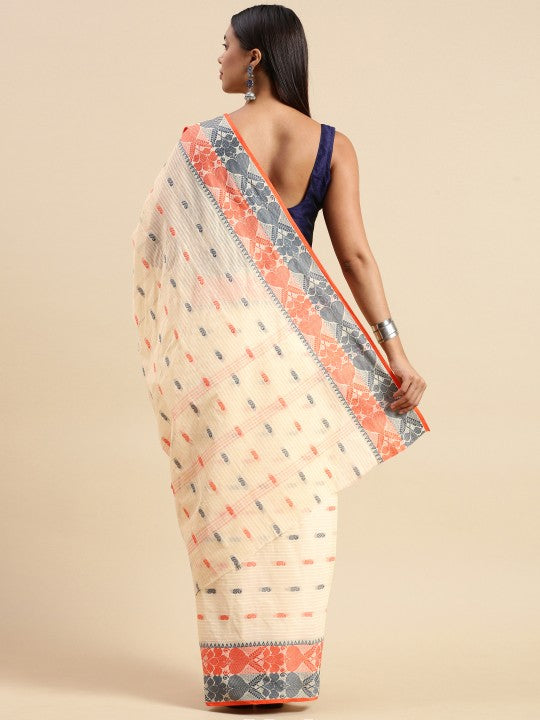 Off white and orange taant saree. Woven design saree with woven design border. The saree does not come with a blouse piece. The model is wearing a blouse for modelling purpose only.