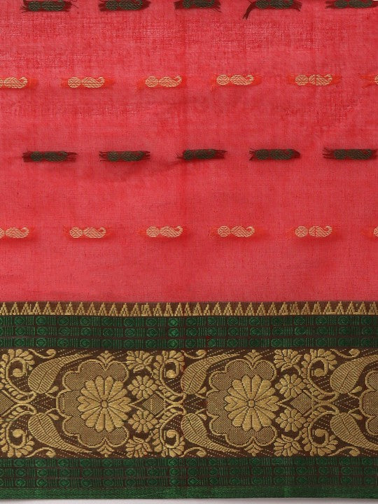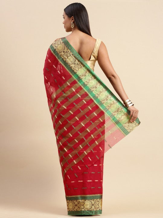 Red and black taant saree. Woven design saree with woven design border. The saree does not come with a blouse piece. The model is wearing a blouse for modelling purpose only.