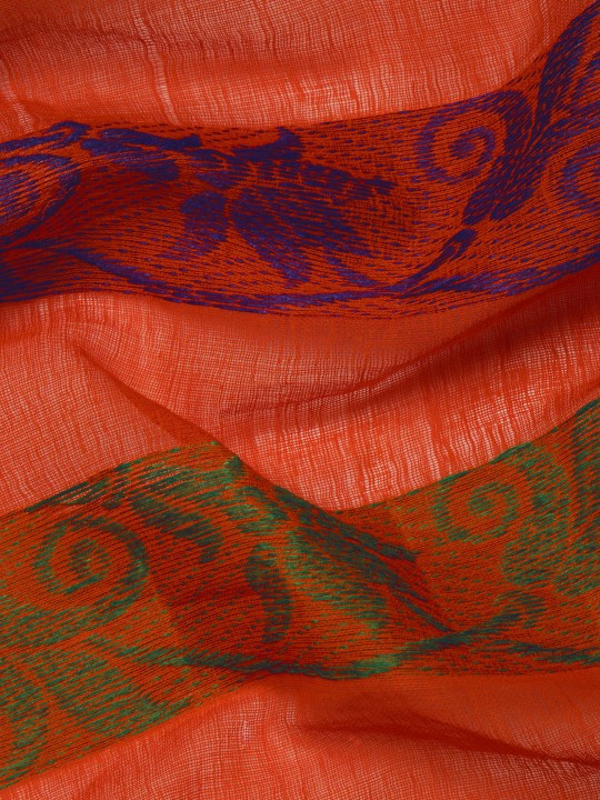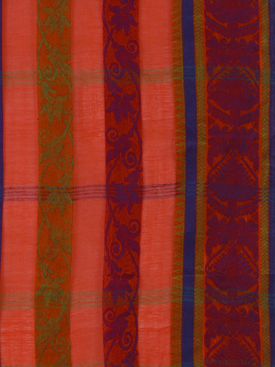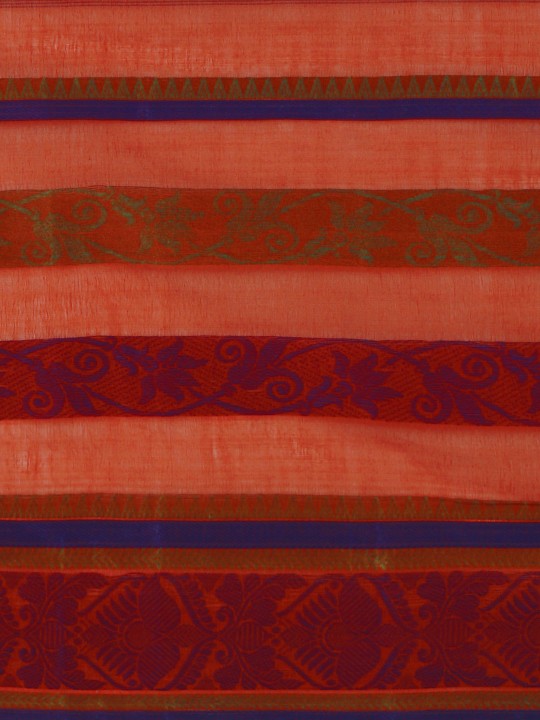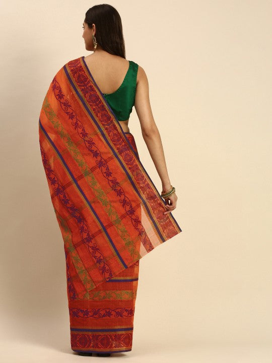 This exquisite orange taant saree from DESH BIDESH features a beautiful woven design throughout. It is further enhanced with a meticulously crafted woven border, adding to its traditional appeal. Made from pure cotton, this saree ensures comfort and breathability for extended wear. Please note, the saree is sold without a blouse piece; the model is wearing one for styling purposes only. The total length of the saree is approximately 5.5 metres, which is about 18.04 feet. Its width measures around 1.06 metres, translating to approximately 41.73 inches. For care, it is recommended to dry clean this delicate garment. Avoid tumble drying and iron on low heat to maintain its quality. Do not bleach the fabric to preserve its vibrant colours. This elegant saree is perfect for various traditional occasions and daily wear.