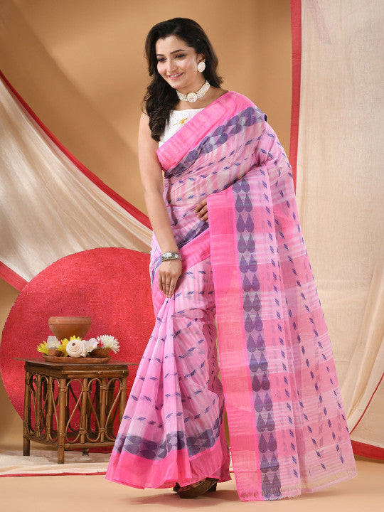 Pink taant saree. Woven design saree with woven design border. The model is wearing a blouse from our stylist's collection, the saree does not come with a blouse piece.