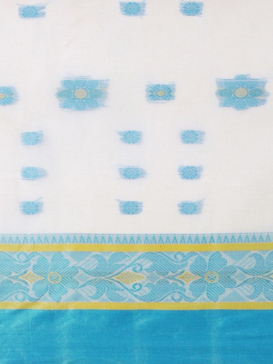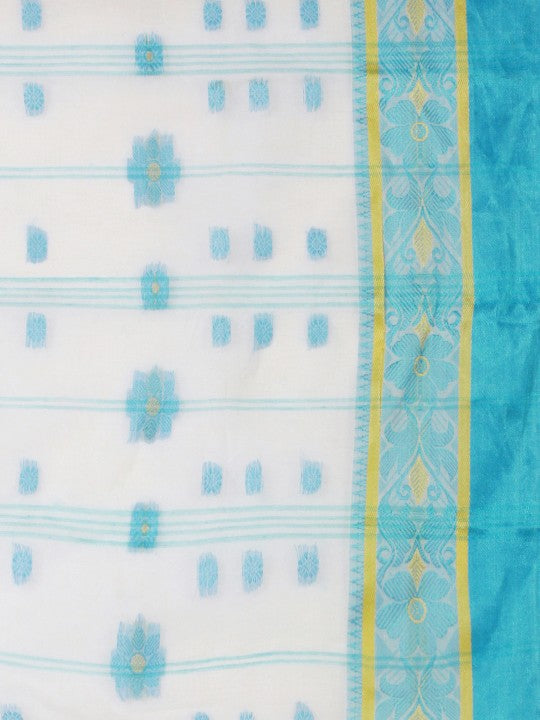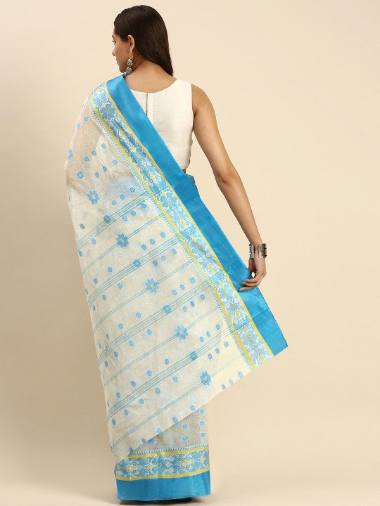 Discover the exquisite DESH BIDESH Woven Design Pure Cotton Taant Saree, a timeless addition to your ethnic wardrobe. This elegant white and blue saree features a traditional woven design with a distinct woven border. Crafted from pure cotton, it offers exceptional comfort and breathability for prolonged wear. The saree measures approximately 18.04 feet in length and 41.7 inches in width, providing ample fabric for graceful draping. Please note, this saree does not include a blouse piece; the model's blouse is for styling reference only. To maintain its pristine condition, this beautiful saree requires professional dry cleaning. Avoid tumble drying and use low heat when ironing to preserve the delicate weave. This saree is perfect for various occasions, from daily wear to festive gatherings. Its intricate design reflects rich Indian textile artistry. Embrace traditional elegance with this pure cotton taant saree.
