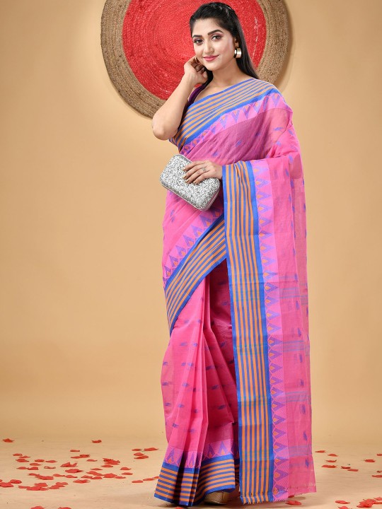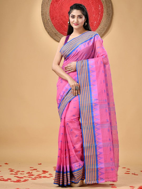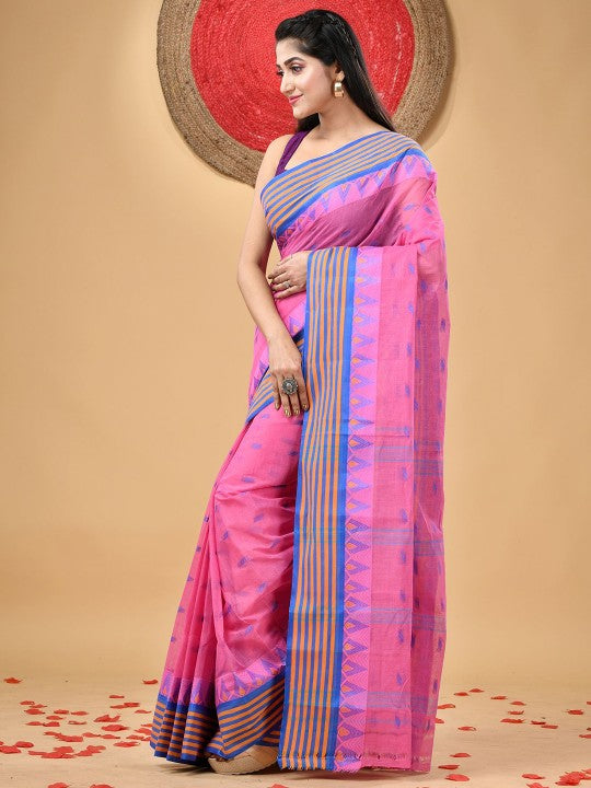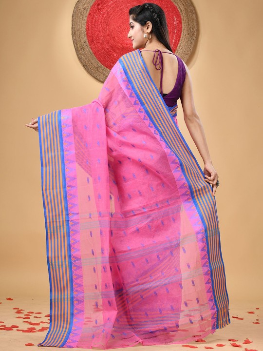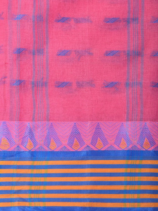 This exquisite saree, crafted from pure cotton, offers a blend of traditional elegance and modern comfort. The woven design features a delicate interplay of pink and blue hues, creating a visually appealing aesthetic. Its lightweight and breathable fabric ensures comfort throughout the day, making it suitable for various occasions. The saree is accompanied by a matching blouse piece, allowing for a cohesive and sophisticated ensemble. The intricate weaving technique employed reflects superior craftsmanship, ensuring durability and a refined finish. This piece is ideal for those who appreciate authentic Indian textiles and seek to make a graceful statement. Its versatility allows it to be draped in multiple styles, enhancing its appeal. The vibrant colors are carefully selected to complement diverse skin tones.