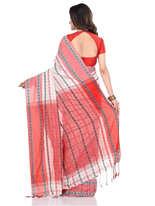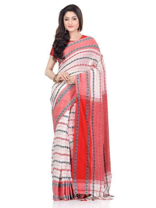 Experience the timeless elegance of the DESH BIDESH Woven Design Pure Cotton Traditional Taant Saree. This exquisite saree features a vibrant white and red colour combination, perfect for any traditional occasion. It showcases an intricate woven design throughout the fabric, highlighting artisanal craftsmanship. The saree is further enhanced by a beautifully woven design border, adding a touch of sophistication. Crafted from pure cotton, it offers exceptional comfort and breathability, making it ideal for extended wear. The saree comes complete with an unstitched blouse piece, allowing for custom tailoring to your perfect fit. Please refer to the blouse piece image to see its actual design and pattern. This traditional taant saree blends heritage with contemporary appeal, ensuring you stand out with grace. Its lightweight nature ensures easy draping and comfortable movement, perfect for all-day festivities. Elevate your ethnic wardrobe with this stunning and authentic piece, celebrating true Indian artistry.