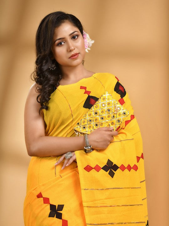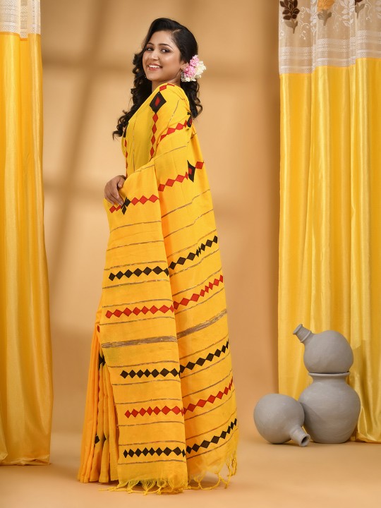 Design Details Yellow and red taant saree. Woven design saree with no border. The saree comes with an unstitched blouse piece. The blouse worn by the model might be for modelling purpose only. Check the image of the blouse piece to understand how the actual blouse piece looks like.