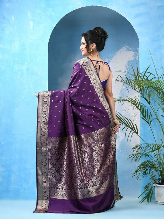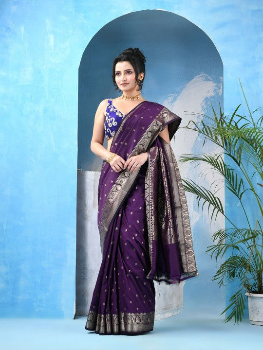 Buy DESH BIDESH Woven Design Zari Kanjeevaram Saree - Sarees for Women from DESH BIDESH at Rs. 1503. This purple and silver-toned kanjeevaram saree features an intricate woven design and a matching woven border. It showcases exquisite zari detailing throughout. The saree includes an unstitched blouse piece, allowing for custom tailoring. Please note, the blouse shown on the model is for styling purposes only; refer to the provided image of the blouse piece for its actual appearance. This elegant saree is perfect for special occasions, offering a blend of traditional craftsmanship and contemporary style.