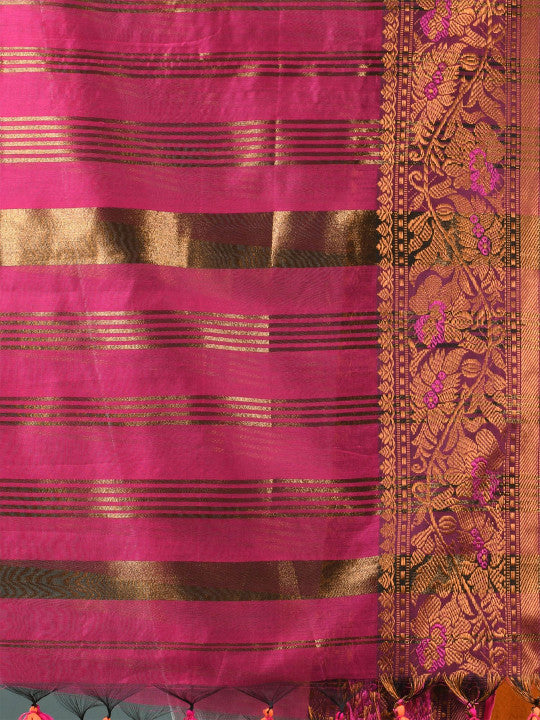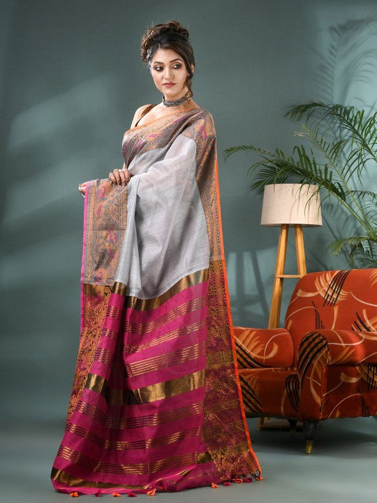 This elegant grey Kanjeevaram saree from DESH BIDESH features a sophisticated woven design. It is a solid saree without a border, offering a clean and contemporary look. The package includes a matching stitched blouse piece, ensuring a complete ensemble. Crafted from a luxurious silk cotton blend, the saree drapes beautifully. This traditional Indian attire is perfect for various festive occasions and cultural events. Its rich texture and subtle design add a touch of grace. The saree is easy to maintain with dry clean only care. Experience the blend of tradition and modern style with this exquisite piece. It's designed for comfort and elegance, making you stand out. This exquisite saree is a perfect addition to any discerning wardrobe.