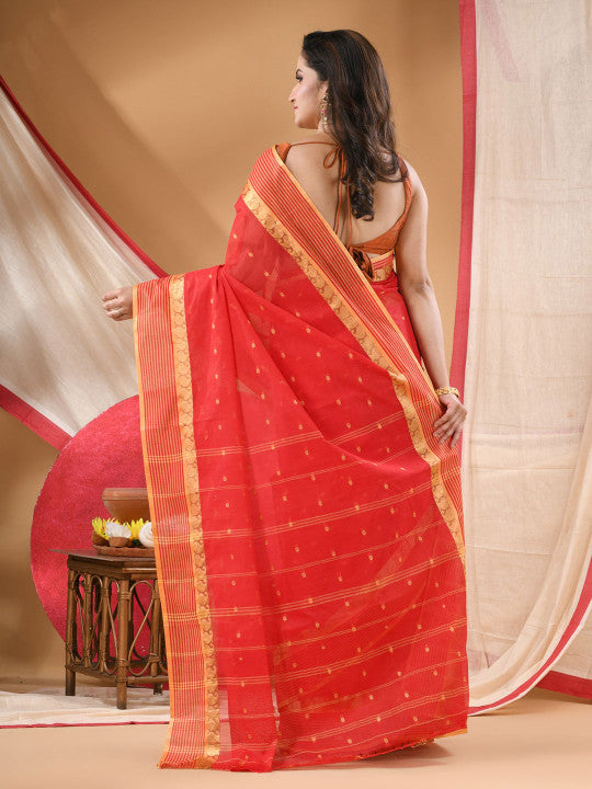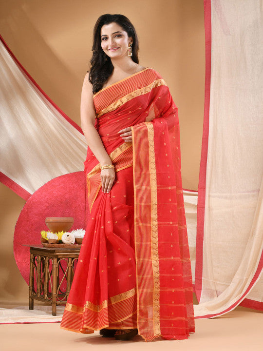 Red jamdani saree. Woven design saree with zari border border. Has zari detail. The model is wearing a blouse from our stylist's collection, the saree does not come with a blouse piece.