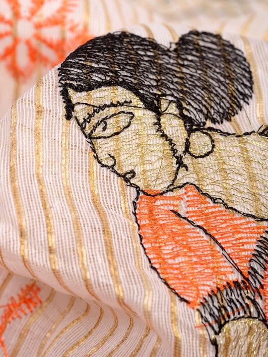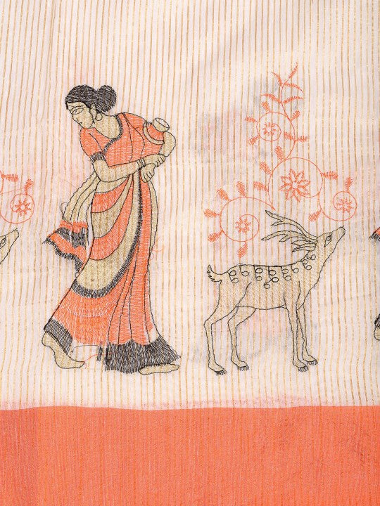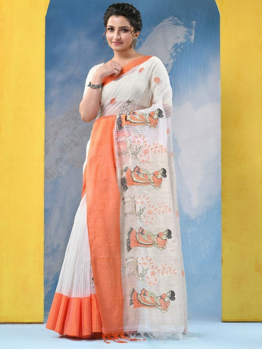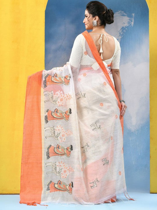White and orange khadi saree. Woven design saree with zari border. Has zari detail. The saree comes with an unstitched blouse piece. The blouse worn by the model might be for modelling purpose only. Check the image of the blouse piece to understand how the actual blouse piece looks like.