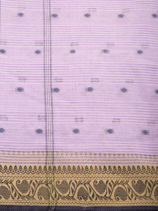 This exquisite purple and gold-toned taant saree is a testament to traditional Indian craftsmanship. It features an intricate woven design throughout the body, showcasing fine artistry. The saree is elegantly framed by a matching woven design border, enhancing its aesthetic appeal. Delicate zari detailing adds a touch of subtle shimmer and opulence to the fabric. Crafted from pure cotton, this saree ensures superior comfort and breathability for extended wear. The lightweight and soft material drapes beautifully, offering a graceful silhouette. Its traditional design makes it a perfect choice for festive occasions, cultural gatherings, or special events. This saree embodies timeless elegance, making it a valuable addition to any ethnic wardrobe. Please note that the model is wearing a blouse from a stylist's collection for presentation purposes. The saree itself does not include a blouse piece, allowing for personalized styling.