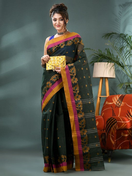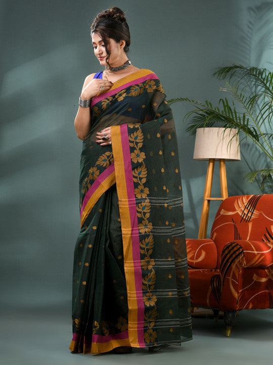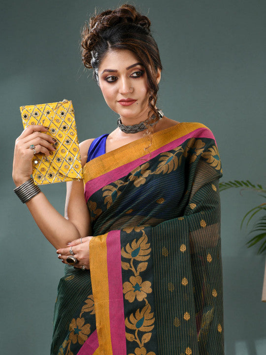 Green and purple taant saree. Woven design saree with solid border. Has zari detail. Without Blouse: The model is wearing a blouse from our stylist's collection, the saree does not come with a blouse piece. Length: 5.5 metres plus 0.8 metre blouse piece. Width: 1.06 metres (approx.). Saree fabric: Pure Cotton. Dry Clean Only.