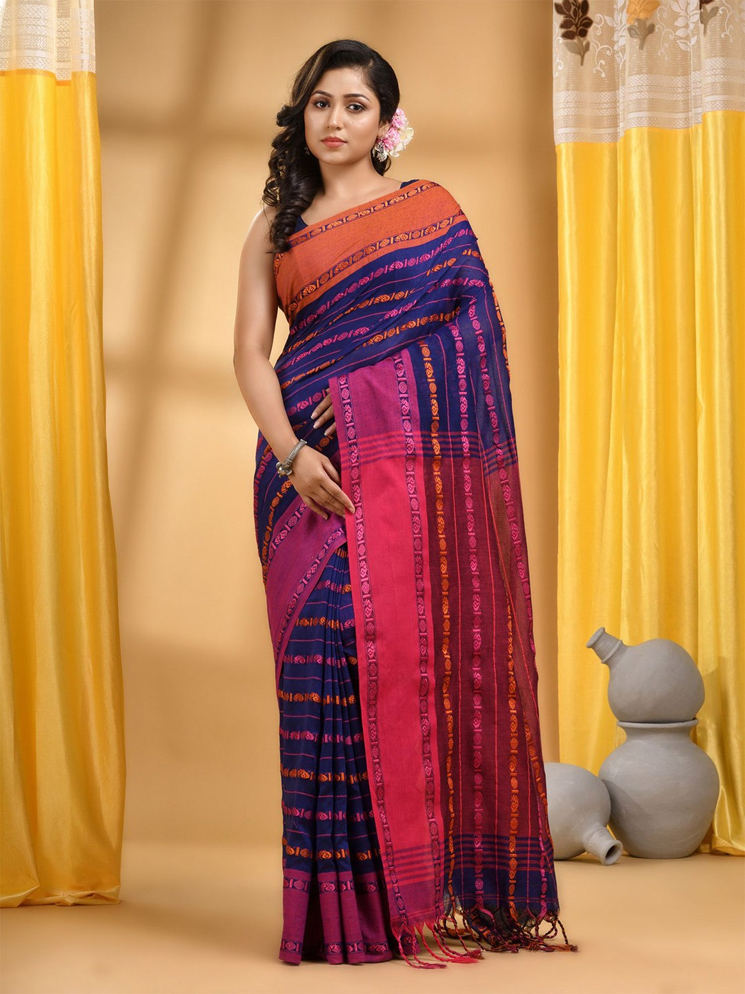 Blue and pink taant saree. Woven design saree with woven design border. Has zari detail. The saree comes with an unstitched blouse piece. The blouse worn by the model might be for modelling purpose only. Check the image of the blouse piece to understand how the actual blouse piece looks like.
