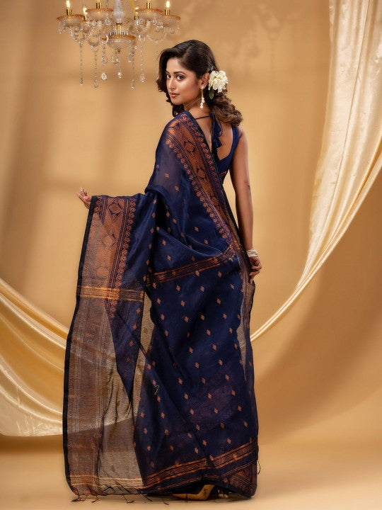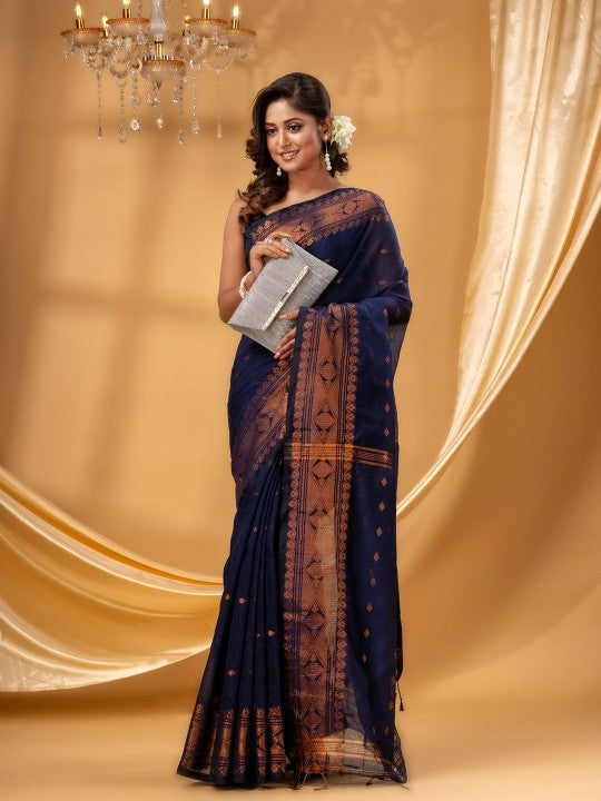 Design Details Navy blue and gold-toned taant saree. Woven design saree with woven design border. Has zari detail. The saree comes with an unstitched blouse piece. The blouse worn by the model might be for modelling purpose only. Check the image of the blouse piece to understand how the actual blouse piece looks like.