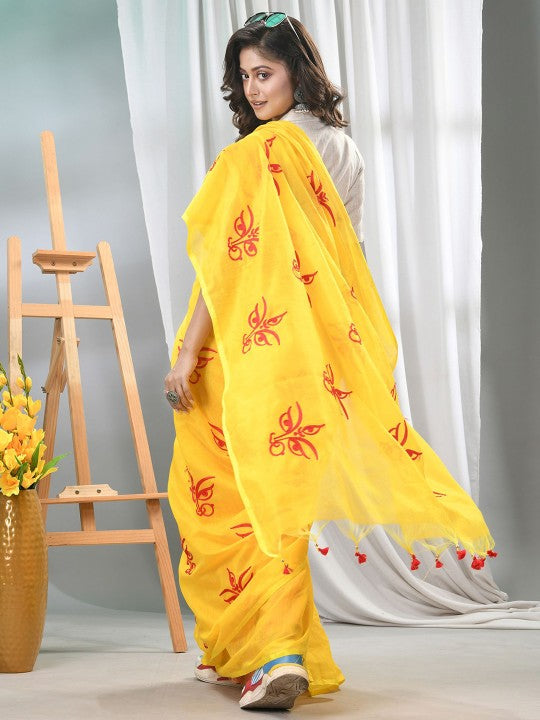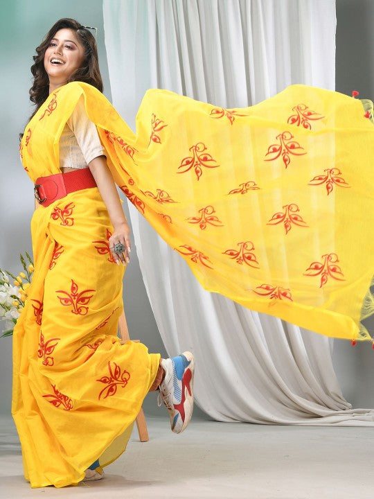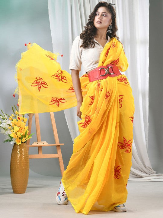 This exquisite yellow and red embroidered saree is a testament to traditional Indian craftsmanship, featuring intricate geometric embroidery that adds a touch of elegance. Crafted from a comfortable cotton blend, this saree is designed for both aesthetic appeal and ease of wear. The vibrant colours and detailed patterns make it suitable for various festive occasions and cultural gatherings. It includes an unstitched blouse piece, allowing for custom tailoring to achieve a perfect fit. The saree drapes beautifully, enhancing the silhouette with its fluid fall. Its design is versatile, making it a valuable addition to any ethnic wardrobe. The fabric ensures breathability and comfort, ideal for extended wear. This piece embodies a blend of classic design with modern sensibility. Dry clean only to maintain its pristine condition and intricate embroidery. The saree promises to elevate your traditional attire with its unique charm.