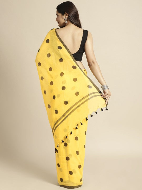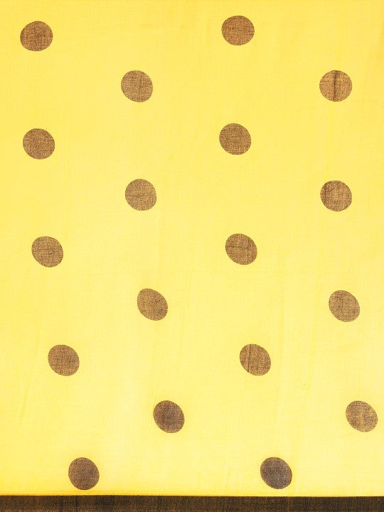 This elegant DESH BIDESH saree features a captivating yellow and black colour combination, perfect for traditional occasions. It showcases a charming polka dot woven design, adding a sophisticated touch. A distinct solid border frames the saree beautifully, highlighting its refined craftsmanship. Crafted from pure cotton, this taant saree ensures breathability and comfort throughout the day. Its lightweight nature provides a graceful drape, enhancing your silhouette. Please note, this saree does not include a blouse piece; the model's blouse is for styling reference only. For maintaining its pristine condition and fabric integrity, dry cleaning is the recommended wash care. This traditional attire is a splendid addition to any woman's ethnic wardrobe. It offers both timeless style and ease of wear. This exquisite cotton taant saree is an ideal choice for cultural events, festive gatherings, or even daily wear.