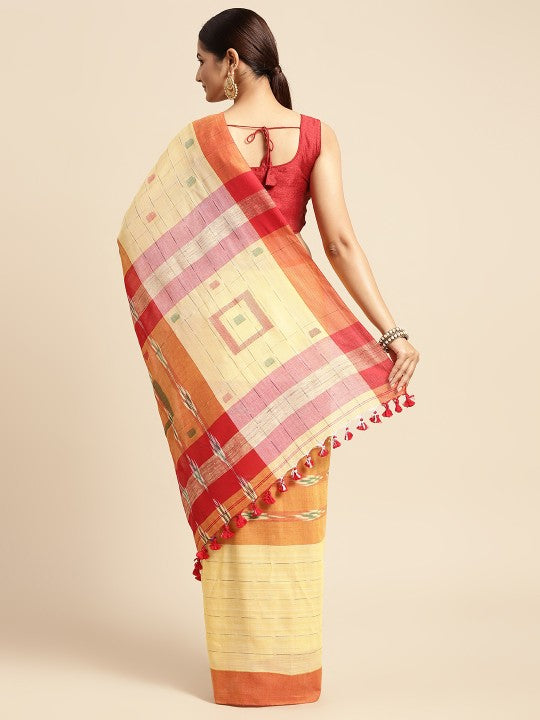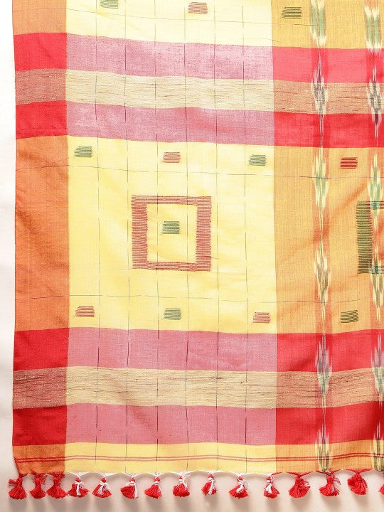 Yellow and green taant saree. Geometric woven design saree with solid border. Disclaimer: The saree comes with an unstitched blouse piece. The blouse worn by the model might be for modelling purpose only. Check the image of the blouse piece to understand how the actual blouse piece looks like.