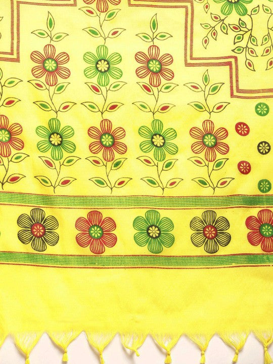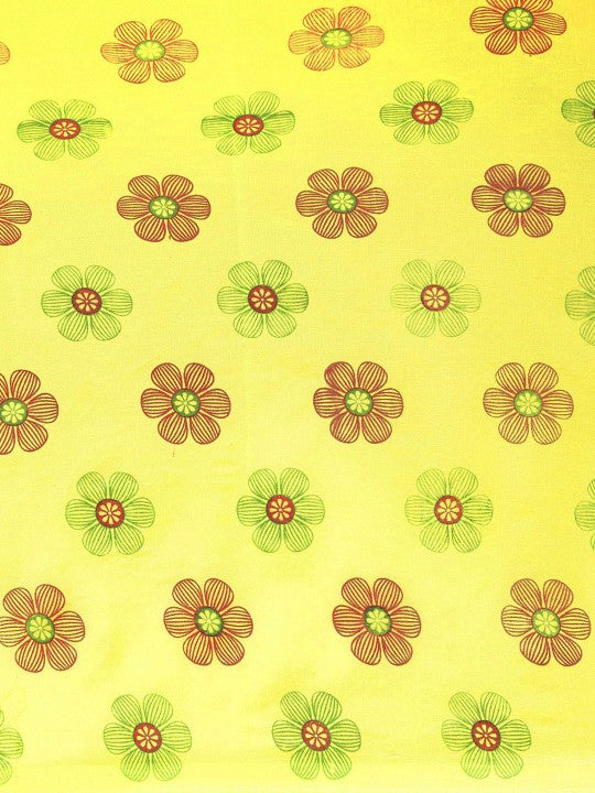 This saree features a yellow and maroon taant design. It is a floral printed saree with a printed border. The saree comes with an unstitched blouse piece. The blouse worn by the model is for modelling purposes only. Please check the image of the blouse piece to understand how the actual blouse piece looks like.