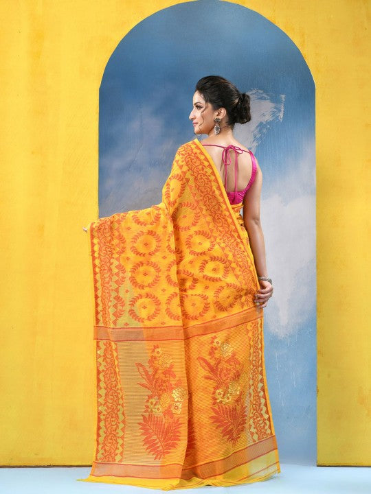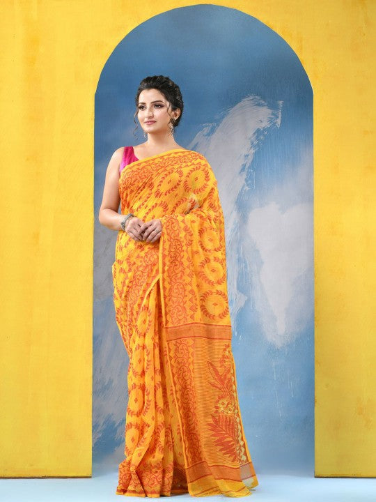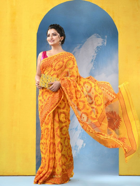 Yellow and orange Jamdani saree, ethnic motifs woven design with woven design border
