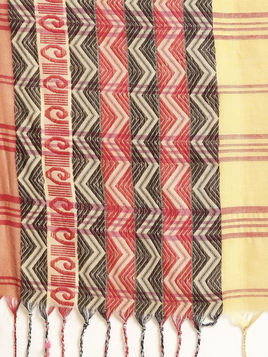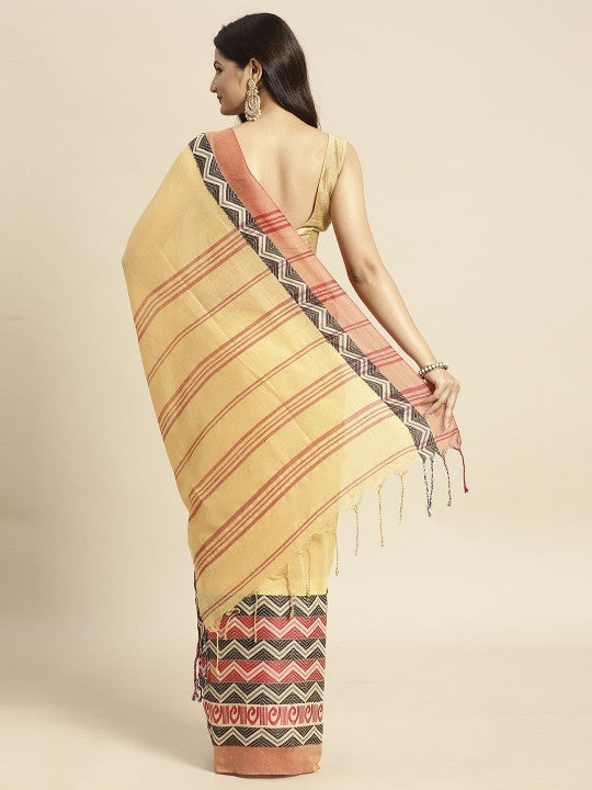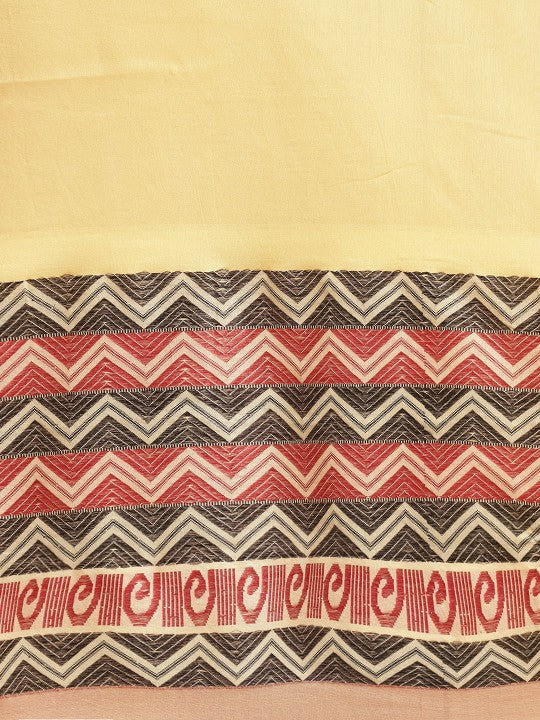 This yellow taant saree features a geometric woven design with a solid border. The saree comes with an unstitched blouse piece. The blouse worn by the model is for modelling purposes only. Please check the image of the blouse piece to understand its actual appearance. The saree length is 5.5 metres, plus a 0.8 metre blouse piece. The approximate width is 1.06 metres. Crafted from pure cotton, this saree requires specific care. Do not tumble dry, iron on low heat, or bleach. Professional dry cleaning is recommended.