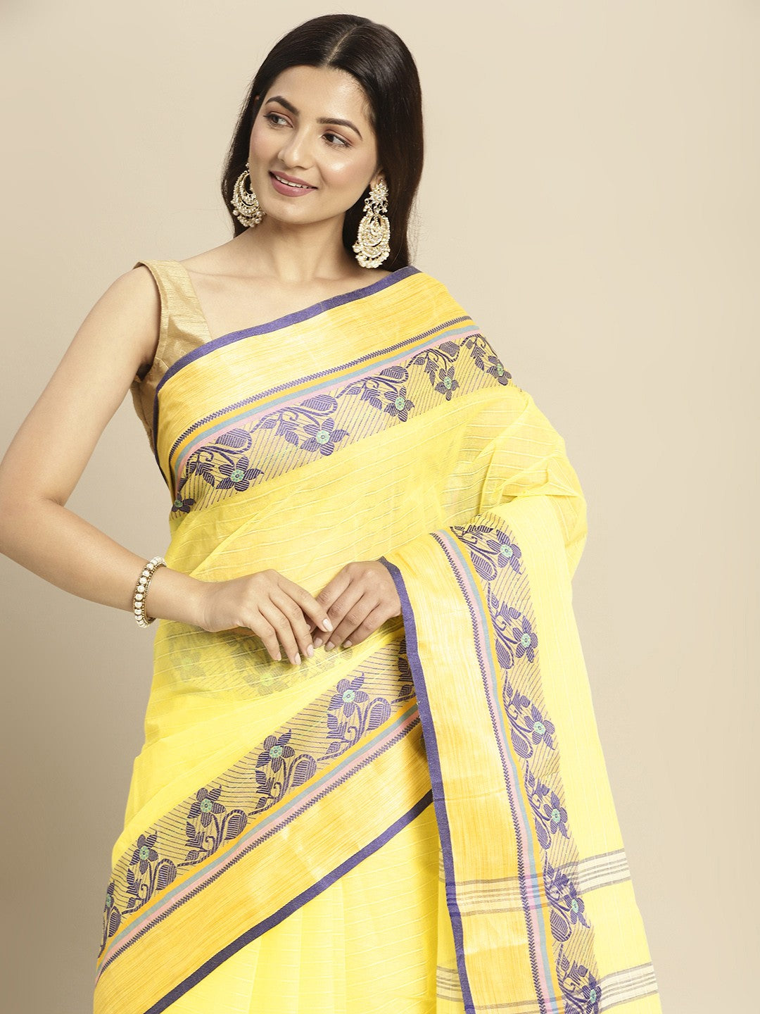 This elegant saree features a striking yellow and purple taant design. It showcases intricate ethnic motifs with a beautifully woven border, adding a touch of traditional charm. Crafted from pure cotton, this saree offers exceptional comfort and a graceful drape. Please note that the saree does not include a blouse piece; the model is wearing one for styling purposes only. For care, it is recommended not to tumble dry, iron on low heat, and opt for professional dry cleaning. Bleaching should be avoided to maintain the fabric's integrity and vibrant colours. This versatile saree measures approximately 5.5 metres in length and 1.06 metres in width, making it suitable for various body types. It's an ideal choice for festive occasions, cultural events, or simply adding a touch of traditional elegance to your everyday wear.