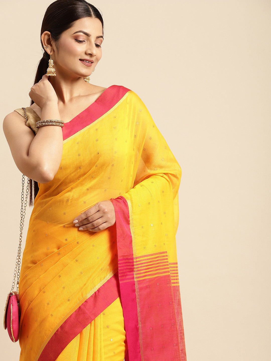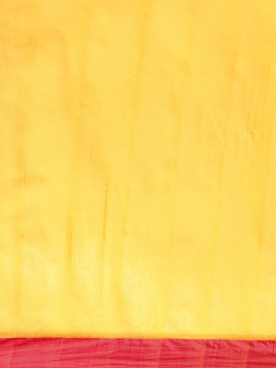 Yellow taant saree with a solid design and solid border. The saree comes with an unstitched blouse piece. The blouse worn by the model is for modelling purposes only; please check the image of the blouse piece to understand the actual look. The saree length is 5.5 metres, plus an 80 centimetres blouse piece. The width is approximately 1.06 metres. Made from pure cotton, it requires dry cleaning.